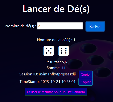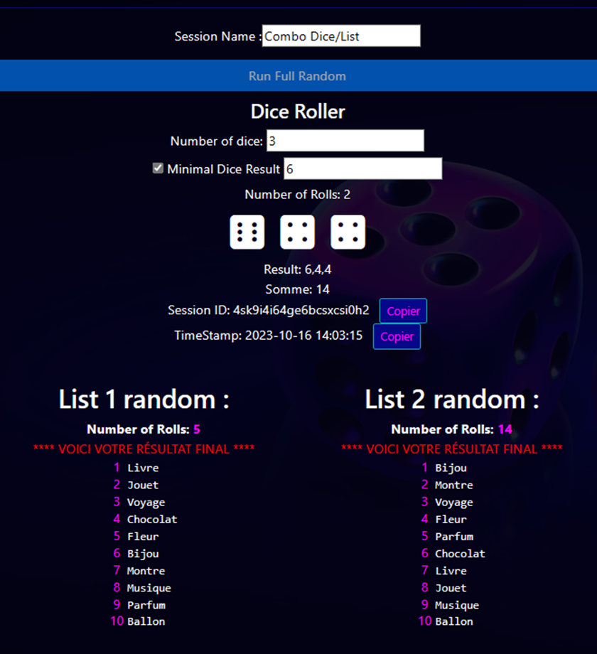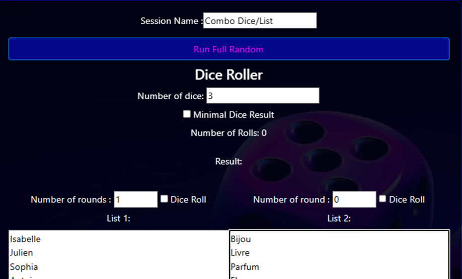 Unissez les forces du Lancer de dé et de la Liste Aléatoire dans une seule et même page. Cette fonction signature Roll'n Shuffle est très efficace et combine à la fois rapidité et justesse.