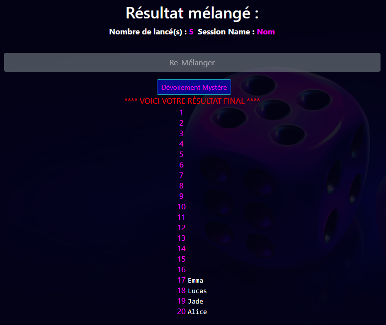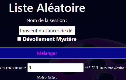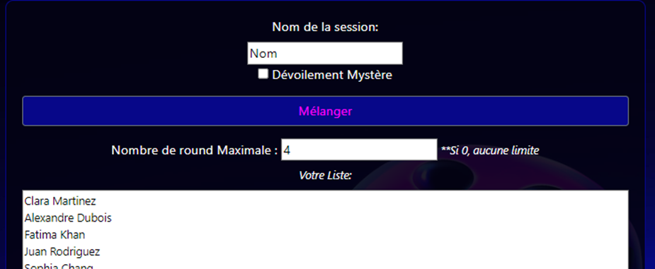 Explorez l'inconnu avec notre fonction Liste Aléatoire. Définissez le nombre de ronde, ajouter votre liste et procéder au mélange.